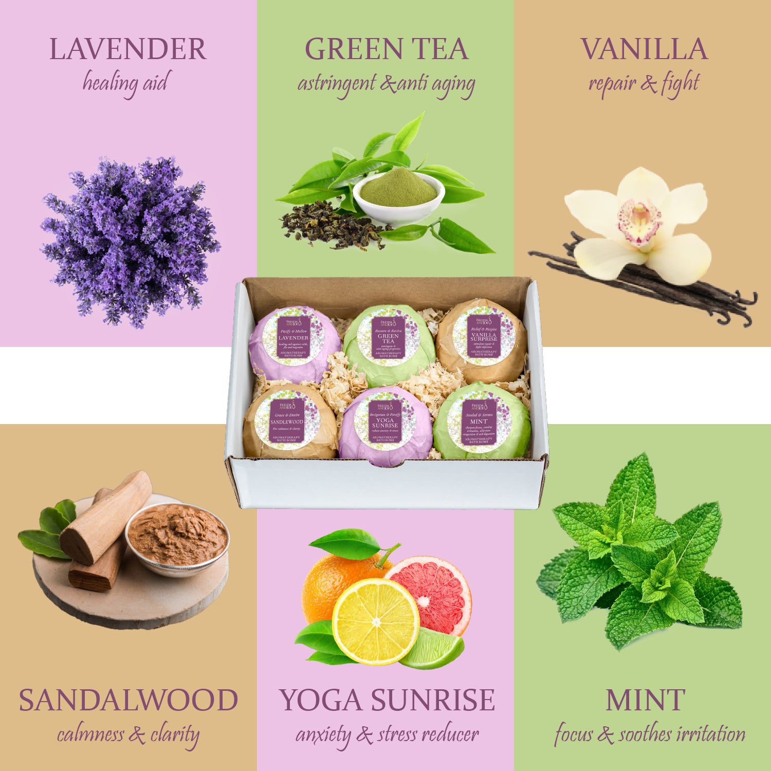 6 Different Calming Scents Bath Bombs: Vanilla, Mint, Lavender, Yoga Sunrise, Sandalwood, & Green Tea