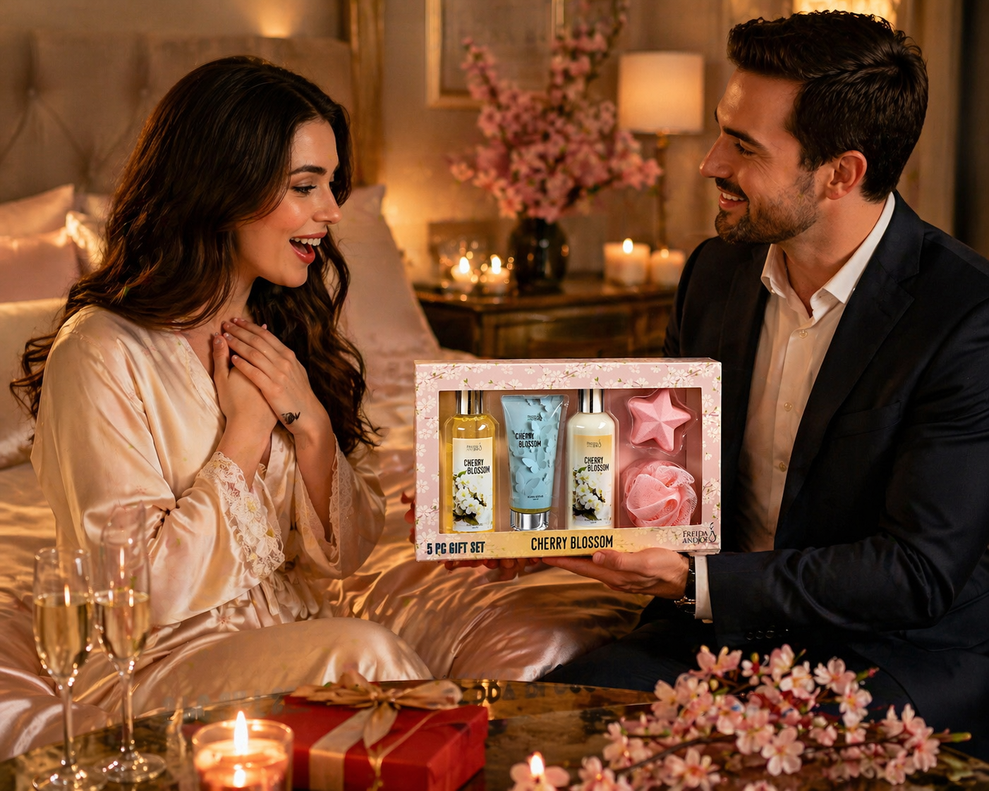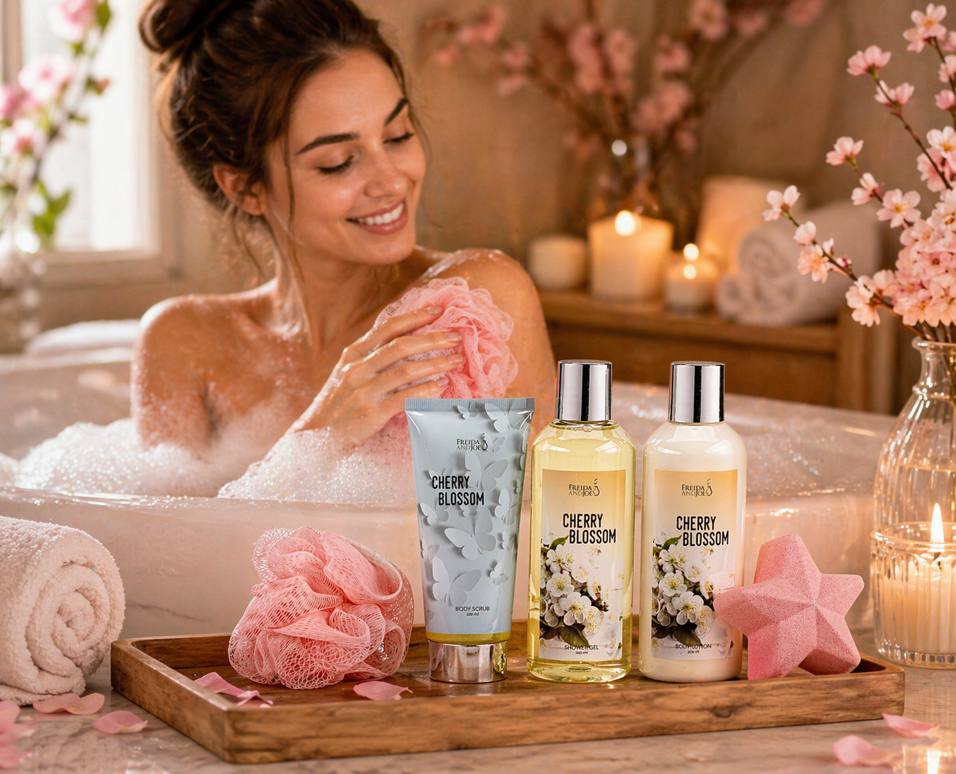 - LUXURIOUS CHERRY BLOSSOM SPA EXPERIENCE Enjoy a relaxing at-home spa experience infused with the delicate and elegant scent of cherry blossom. Designed to help you unwind, de-stress, and indulge in self-care.